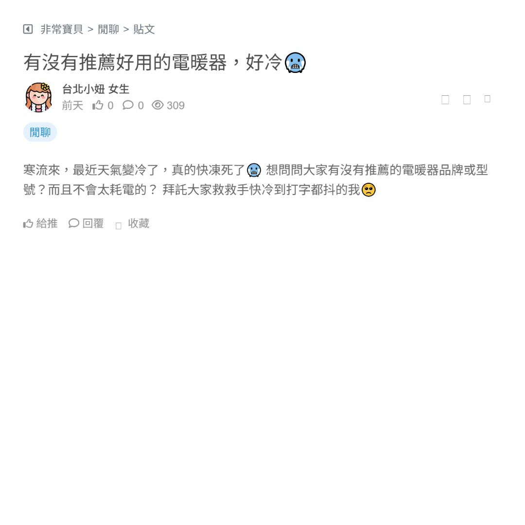 寒流來,最近天氣變冷了,真的快凍死了🥶 想問問大家有沒有推薦的電暖器品牌或型號?而且不會太耗電的? 拜託大家救救手快冷到打字都抖的我🥺