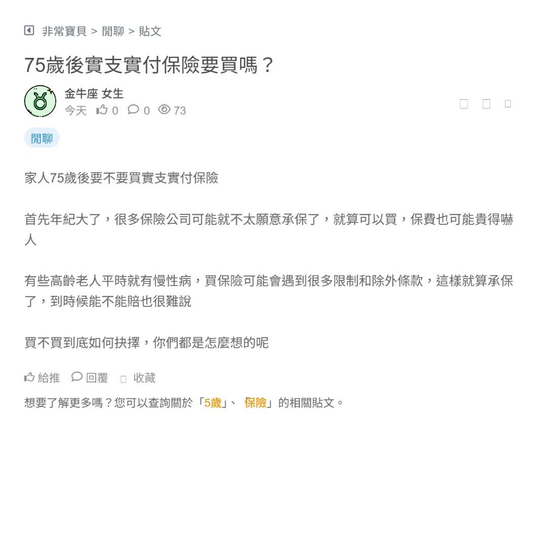 首先年紀大了,很多保險公司可能就不太願意承保了,就算可以買,保費也可能貴得嚇人