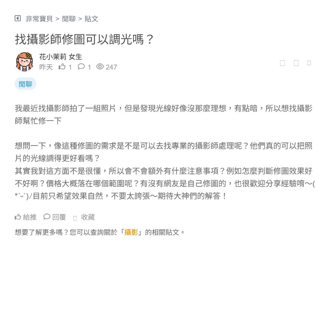 我最近找攝影師拍了一組照片,但是發現光線好像沒那麼理想,有點暗,所以想找攝影師幫忙修一下
