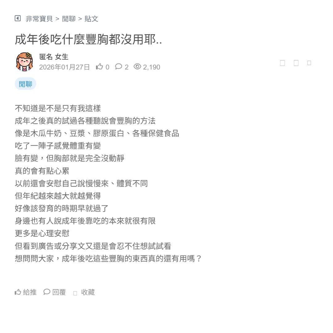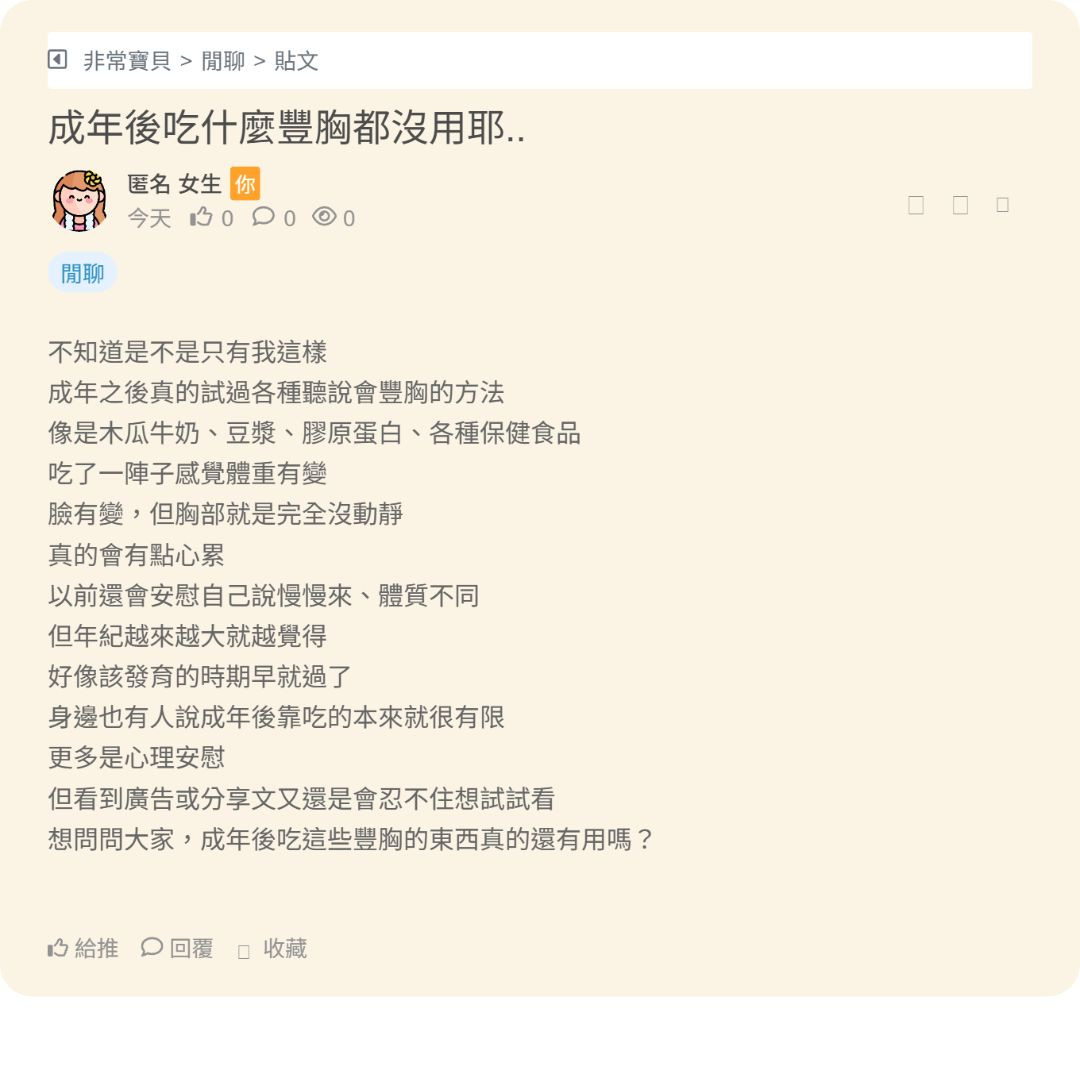 有時候真的會忍不住想這個問題 不是說一定要多大,而是每次照鏡子 試衣服的時候,總覺得少了一點線條 衣服怎麼穿都撐不起來 看朋友穿簡單的T恤、洋裝就很好看 我卻還要一直調內衣、挑版型 心裡多少會有點失落 其實理性上也知道自信不該只跟胸部有關 但生活中真的很容易被影響 拍照會不自覺縮肩、駝背 甚至連站姿都變得沒那... 看更多