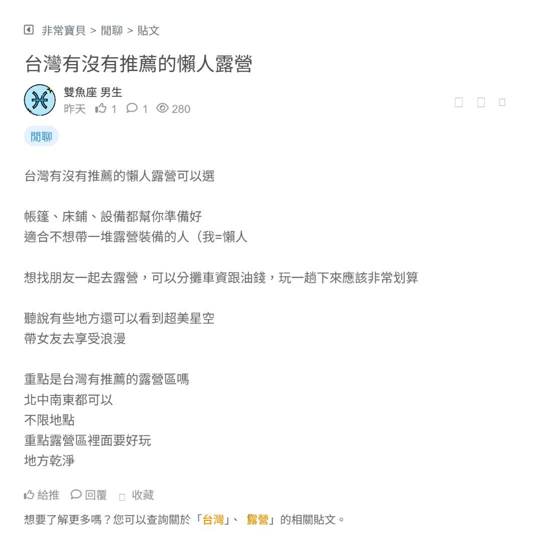 營區貴得跟飯店一樣..大家有推薦什麼露營的好一點嗎?真的不要太貴(漲太兇都先不要)環境好的、半夜不吵… 看更多