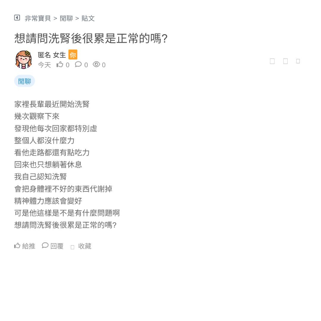最近家人剛開始洗腎 說真的整個過程比我想像的還要需要調適 以前他至少還會出去散步 偶爾陪我們逛個超市但開始固定洗腎後 我明顯感覺到體力掉很快 走一小段路就會喘、吃東西也吃不多 整個人看起來就是容易累 雖然醫生說剛開始洗腎本來就需要一段時間讓身體習慣 可是身為家屬看到還是會忍不住擔心 也不知道是不是營養不夠 還... 看更多