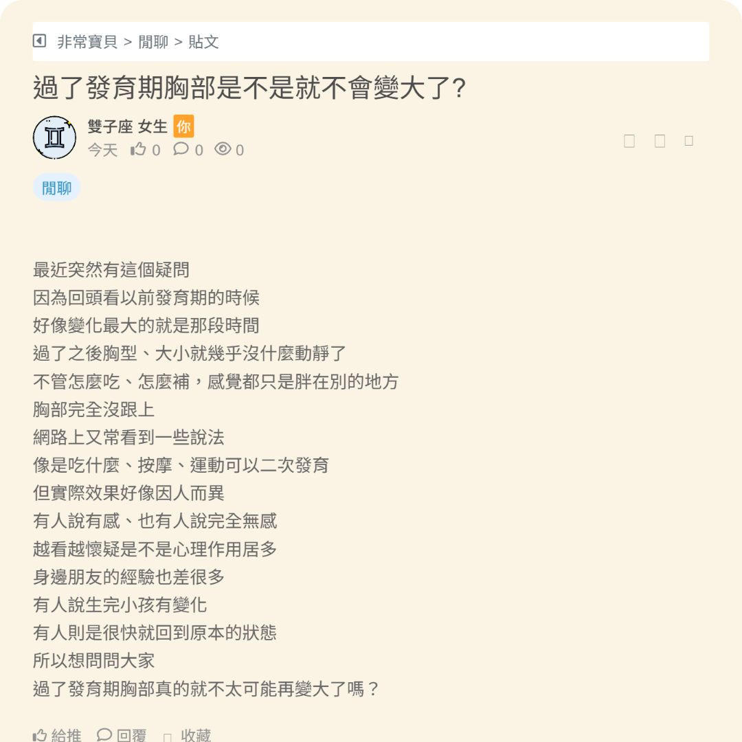不知道是不是只有我這樣 成年之後真的試過各種聽說會豐胸的方法 像是木瓜牛奶、豆漿、膠原蛋白、各種保健食品 吃了一陣子感覺體重有變 臉有變,但胸部就是完全沒...