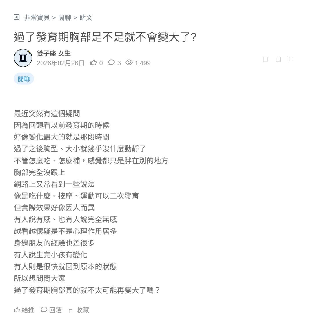 不知道是不是只有我這樣 成年之後真的試過各種聽說會豐胸的方法 像是木瓜牛奶、豆漿、膠原蛋白、各種保健食品 吃了一陣子感覺體重有變 臉有變,但胸部就是完全沒動靜 真的會有點心累 以前還會安慰自己說慢慢來、體質不同 但年紀越來越大就越覺得 好像該發育的時期早就過了 身邊也有人說成年後靠吃的本來就很有限 更多是心理... 看更多