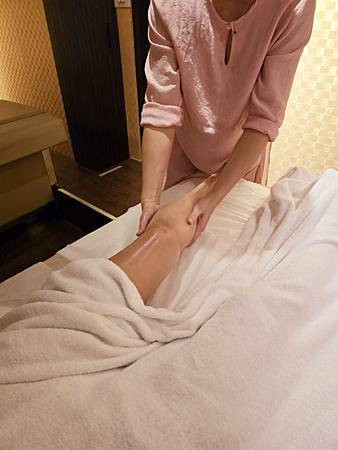 塗上精油腿部手技按摩,感覺腿部變得輕盈,就連腳指頭都有放鬆到
