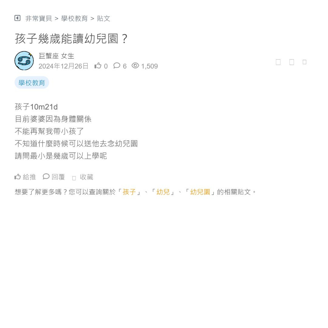 請益托嬰/幼幼班幼兒園報名時間,這個要很提早多久就要去報名了? 寶寶目前4m我婆婆在帶,預計7m送托,2歲進幼幼班,先謝謝大家的回覆,兒子還在睡覺中(-_-)zzz作息好亂… 看更多