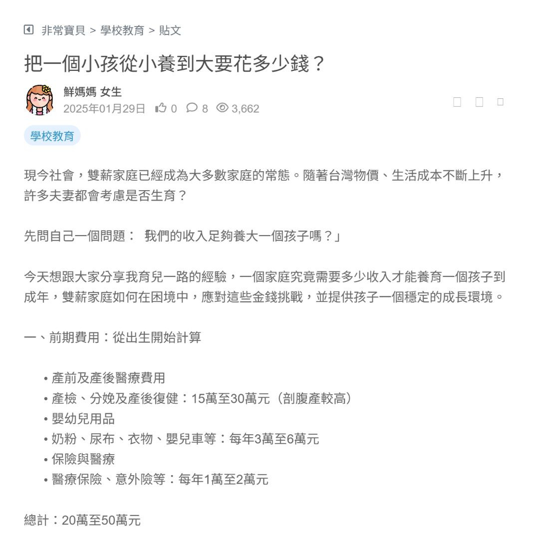 不光是生孩子的費用龐大,養育的部分更是一筆鉅額的支出。