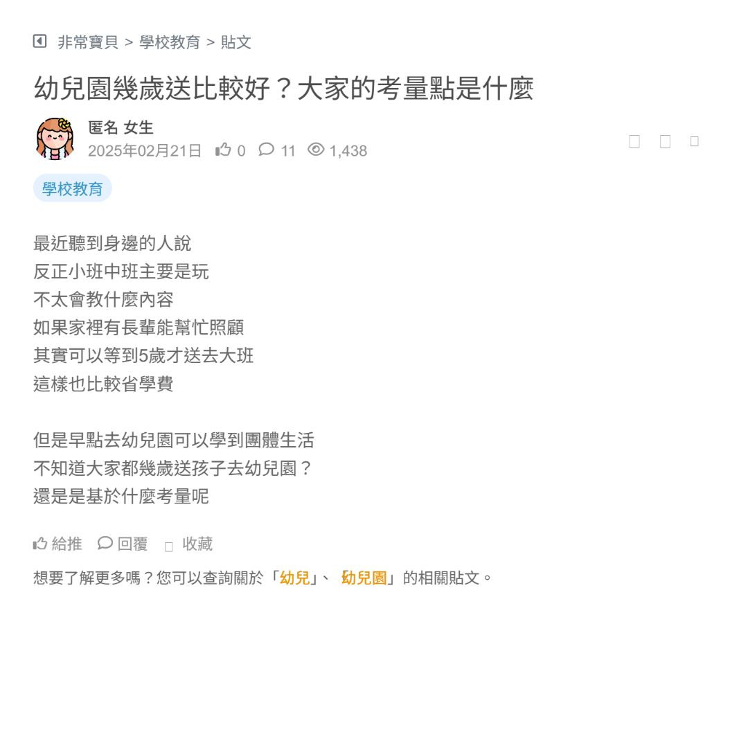 做晚跟老公為要不要讓兒子去幼幼班吵得很兇 我在娘家幫忙工作(家族事業) 可以邊帶小孩 長輩也會幫忙照顧 我覺得太小送幼幼班容易生病 而且幼兒語言表達還不成熟 有被忽視或被霸凌的風險 每月多出近兩萬學費 經濟上也覺得不划算 老公堅持要明年要早送 我是想等到三歲再送小班 為什麼要這麼急?? 看更多