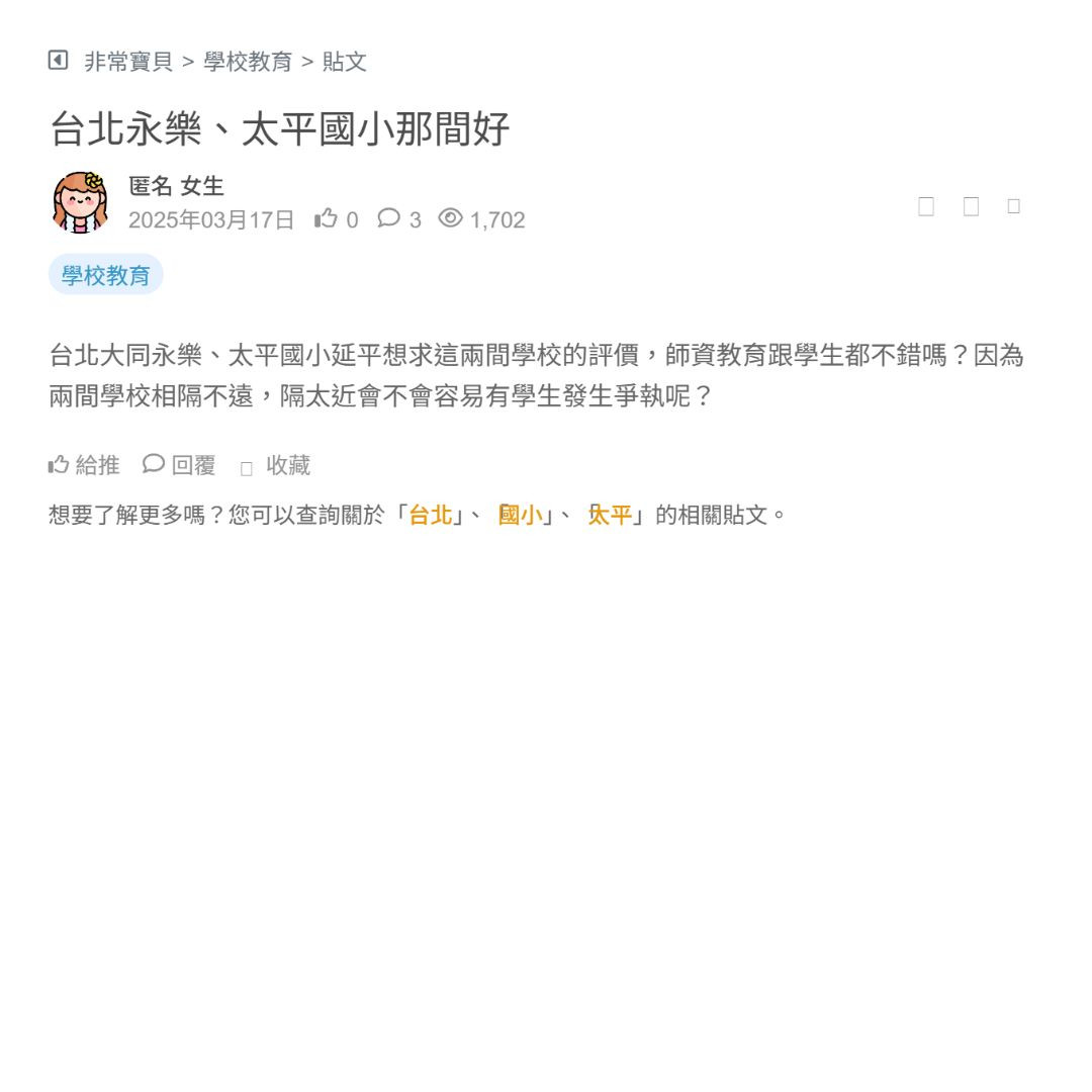台北大同永樂、太平國小延平想求這兩間學校的評價,師資教育跟學生都不錯嗎?因為兩間學校相隔不遠,隔太近會不會容易有學生發生爭執呢?