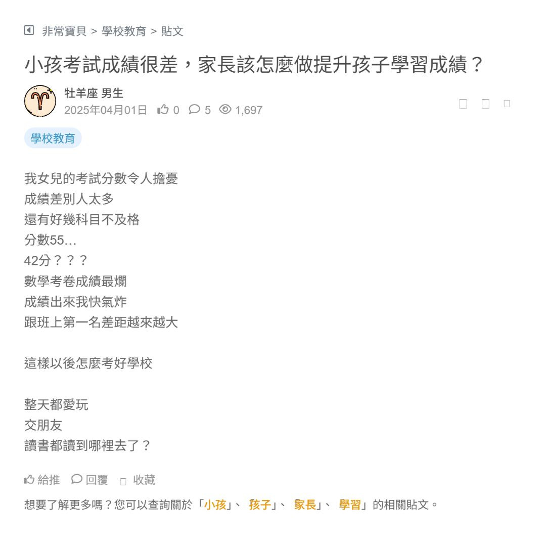 現在的小孩壓力爆表 每天像在趕成績的競賽 放學不是回家 是直奔補習班 晚飯邊吃邊急著去補習 睡眠不足睡不飽精神狀況越來越差 考試成績被當成唯一努力的證明 似乎其他能力都不值錢 家長想盡辦法幫孩子爭取未來 老師也受制於升學壓力評分標準讓教學變得機械化 同儕間的比較壓力 無形中變成心理負擔 輸了... 看更多