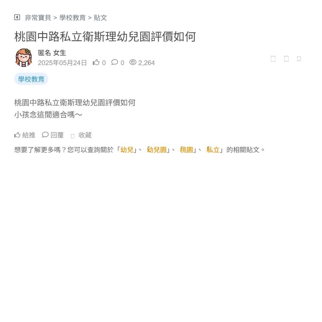 想請問桃園有沒有什麼幼兒園不錯大家有推薦的?地點是桃園市區附近,謝謝 看更多