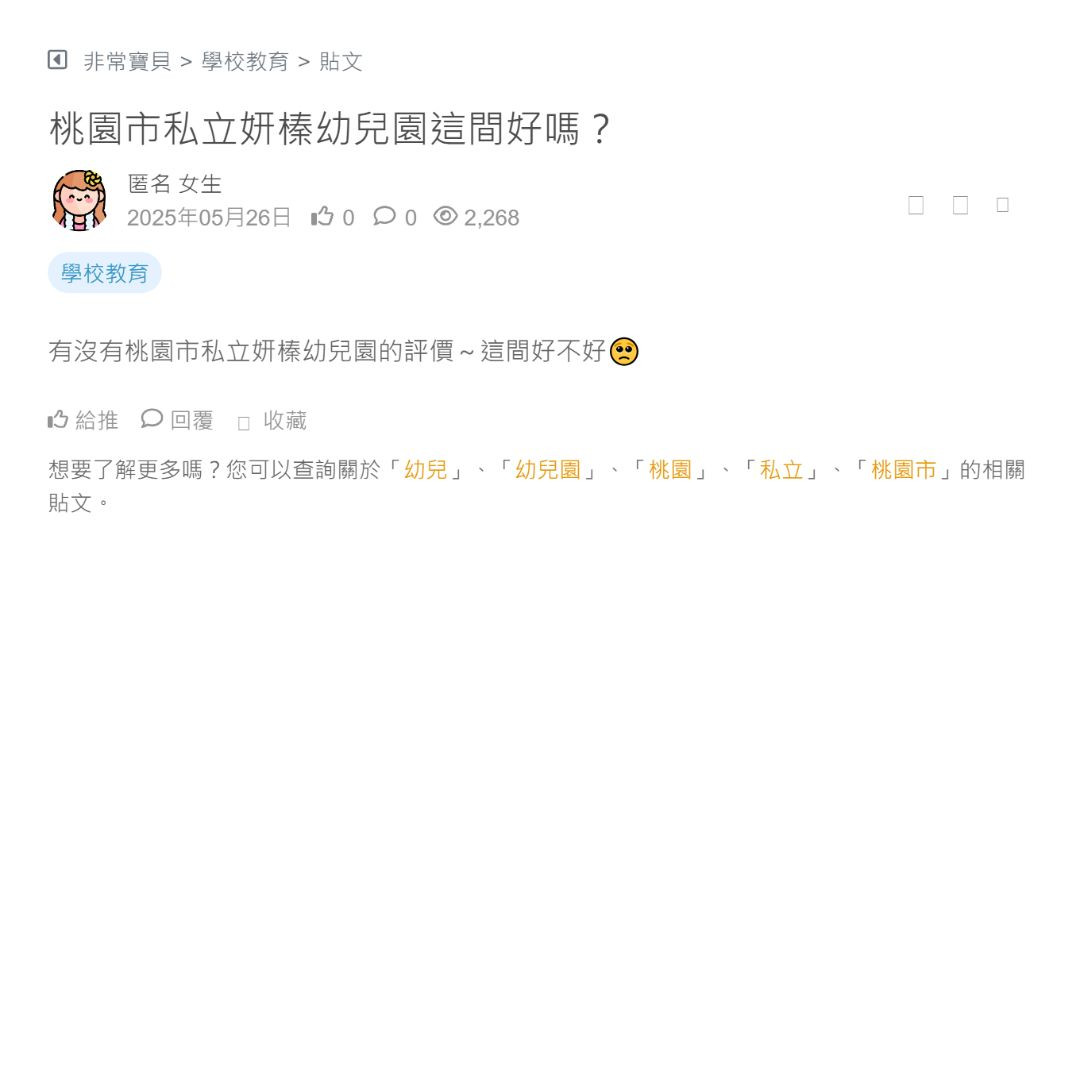 想請問桃園有沒有什麼幼兒園不錯大家有推薦的?地點是桃園市區附近,謝謝 看更多