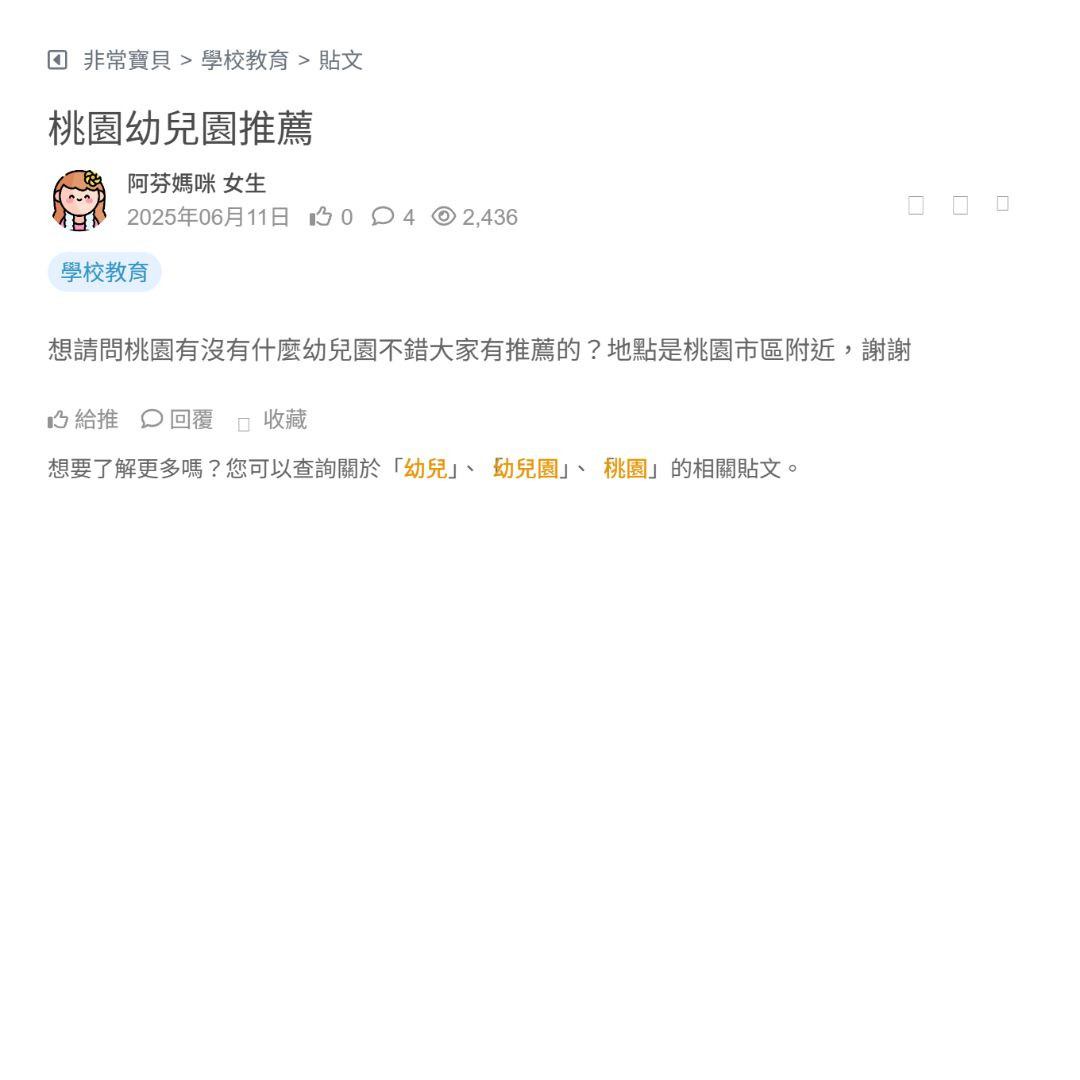 女兒快2歲,想幫他找幼兒園,但我希望能找到上半天的 請問住在桃園的朋友,有沒有推薦的幼兒園可以只上半天呢? 看更多