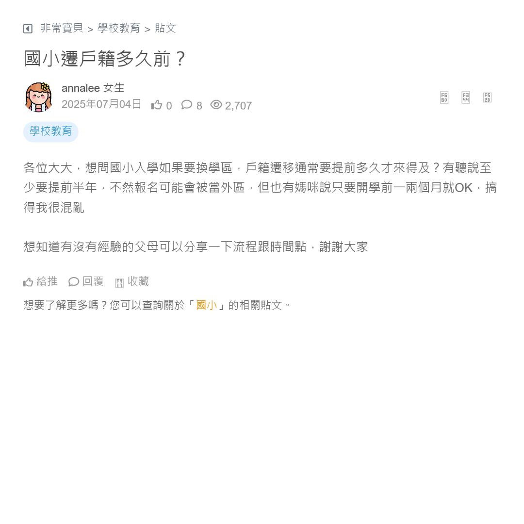 各位大大,想問國小入學如果要換學區,戶籍遷移通常要提前多久才來得及?有聽說至少要提前半年,不然報名可能會被當外區,但也有媽咪說只要開學前一兩個月就OK,搞得我很混亂
