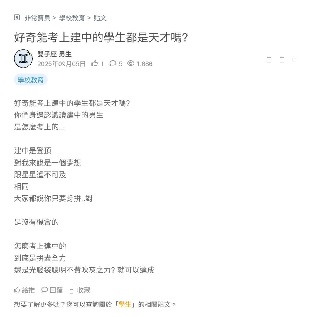 建中好考嗎? 每年錄取率都非常低 要考進建中幾乎是要把所有科目都準備到最高水準 不能出錯 所以到底有多難考? 看更多