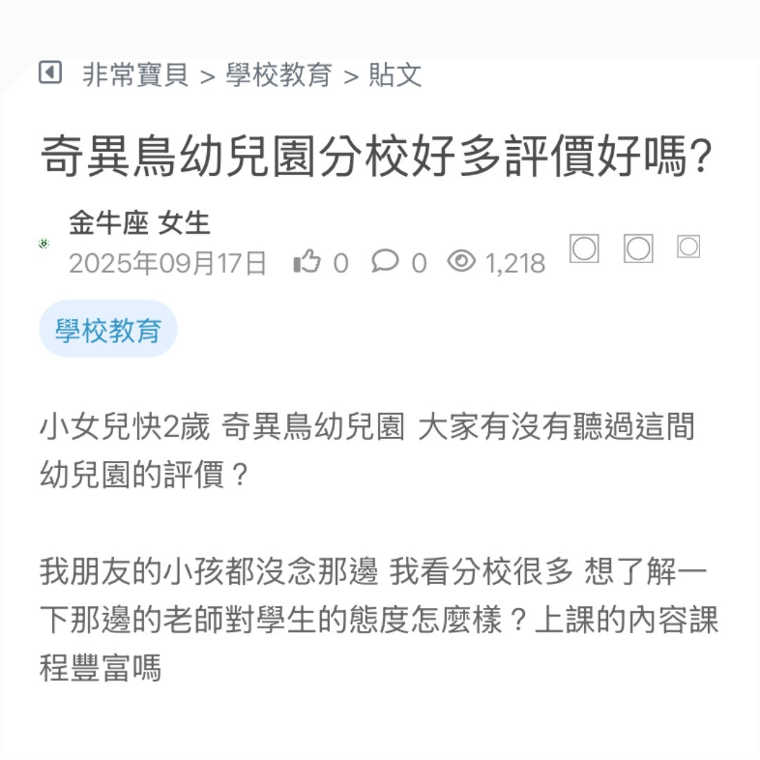 小女兒快2歲 奇異鳥幼兒園 大家有沒有聽過這間幼兒園的評價?