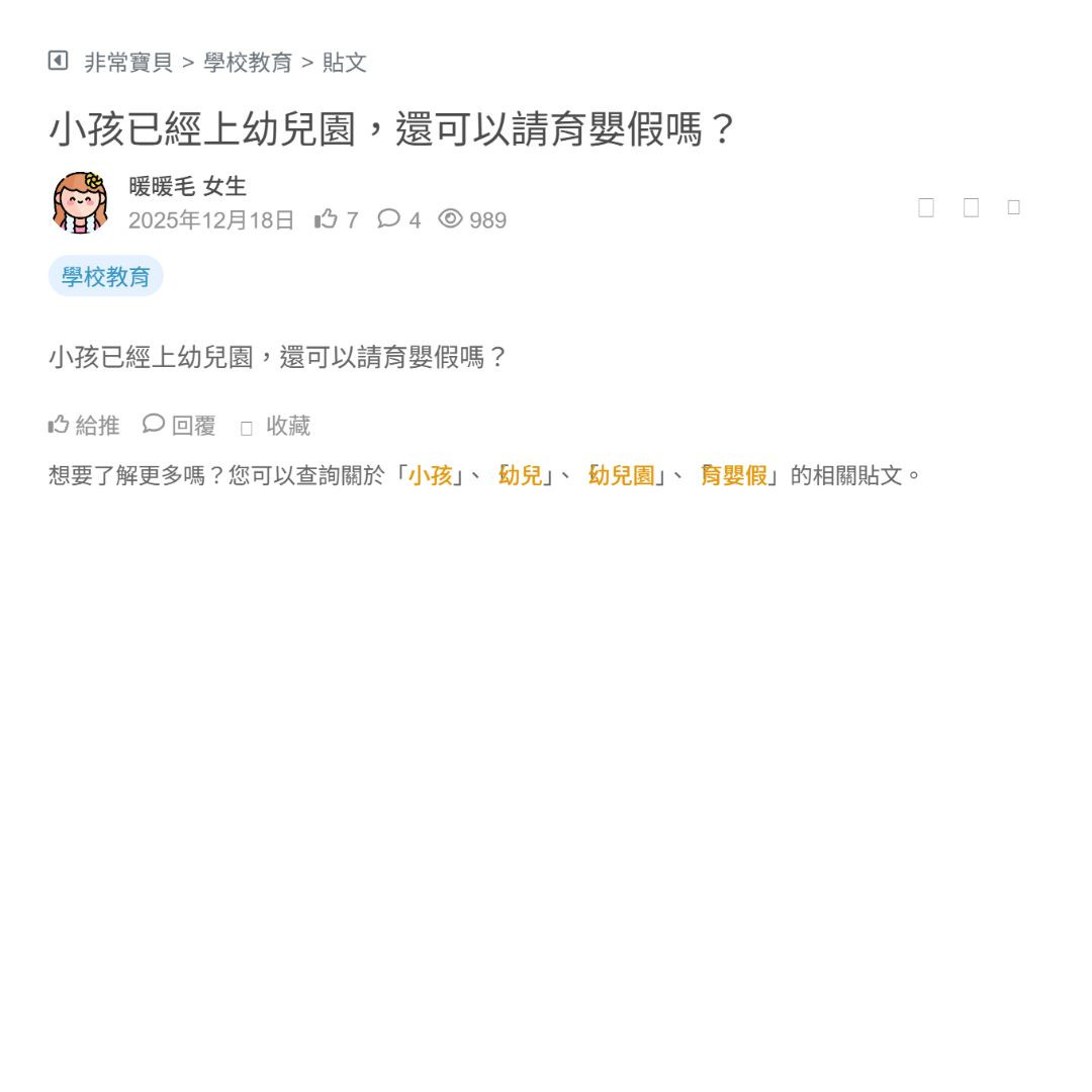 最近真的每天都在天人交戰……育嬰假下個月就滿了,公司也有打來問我什麼時候回去,主管還蠻期待我能回去的😢 但我現在每天陪小孩、接送、餵飯、洗澡、聽他亂唱歌...