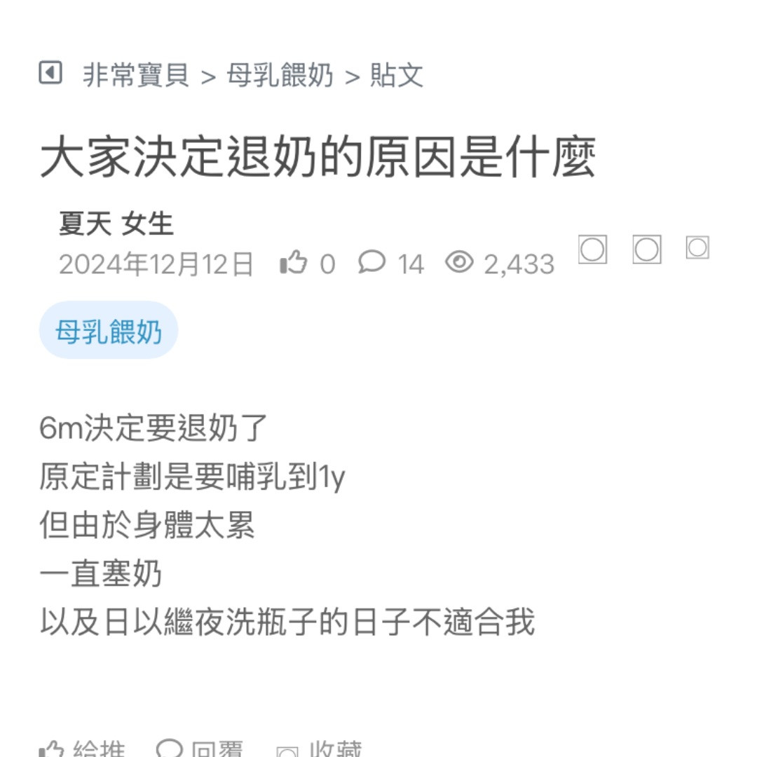 沒辦法持續下去 我直接30天一到就退奶 哺乳過程塞奶塞到爆.. 找泌乳師通乳 還是塞 每天瘋狂擠乳 喝湯湯水水 猛買鮮奶茶想要爆汁 雖然奶量有上來一點 但追奶好難 好漫長 也有在考慮第二胎要不要認真餵 第一胎就這樣結束 可能是我沒用對方法 這幾天很懊惱 覺得退奶後有點後悔 不知道退奶後的媽咪是不是也會這樣 很憂鬱😞... 看更多
