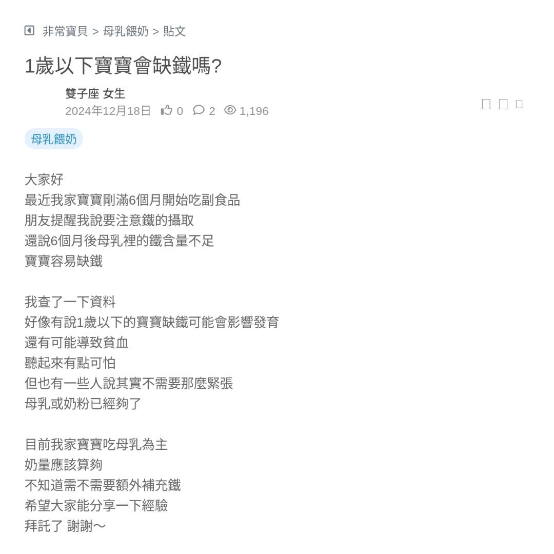 好像有說1歲以下的寶寶缺鐵可能會影響發育