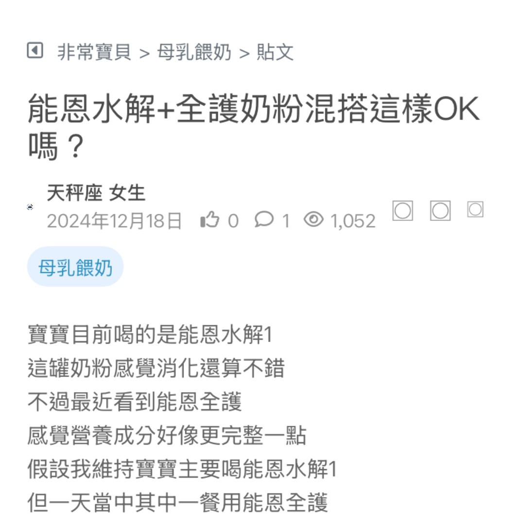 想請問有沒有媽咪幫寶寶從能恩全護轉成能恩水解的經驗?🥺 我家寶寶現在4個月,之前喝能恩全護都還可以,但最近有點腸胃不適、排便比較稀,醫生建議可以考慮試試...