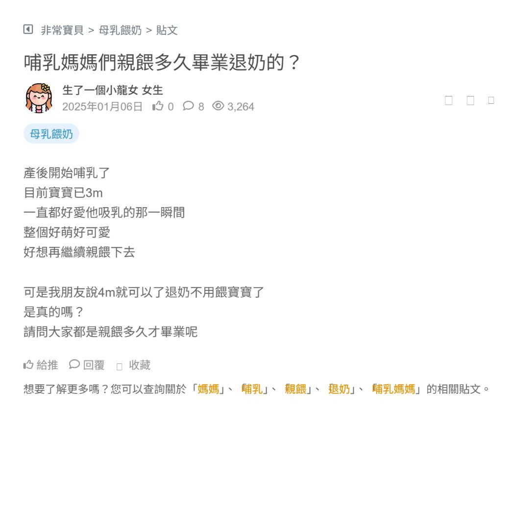 我朋友是一位護理師 她告訴我很多媽媽不想餵母奶 但他們只是因為「不想」餵奶 那些媽媽明明有時間而且不用工作 也有後援可以幫忙 這讓我也開始思考 為什麼有...