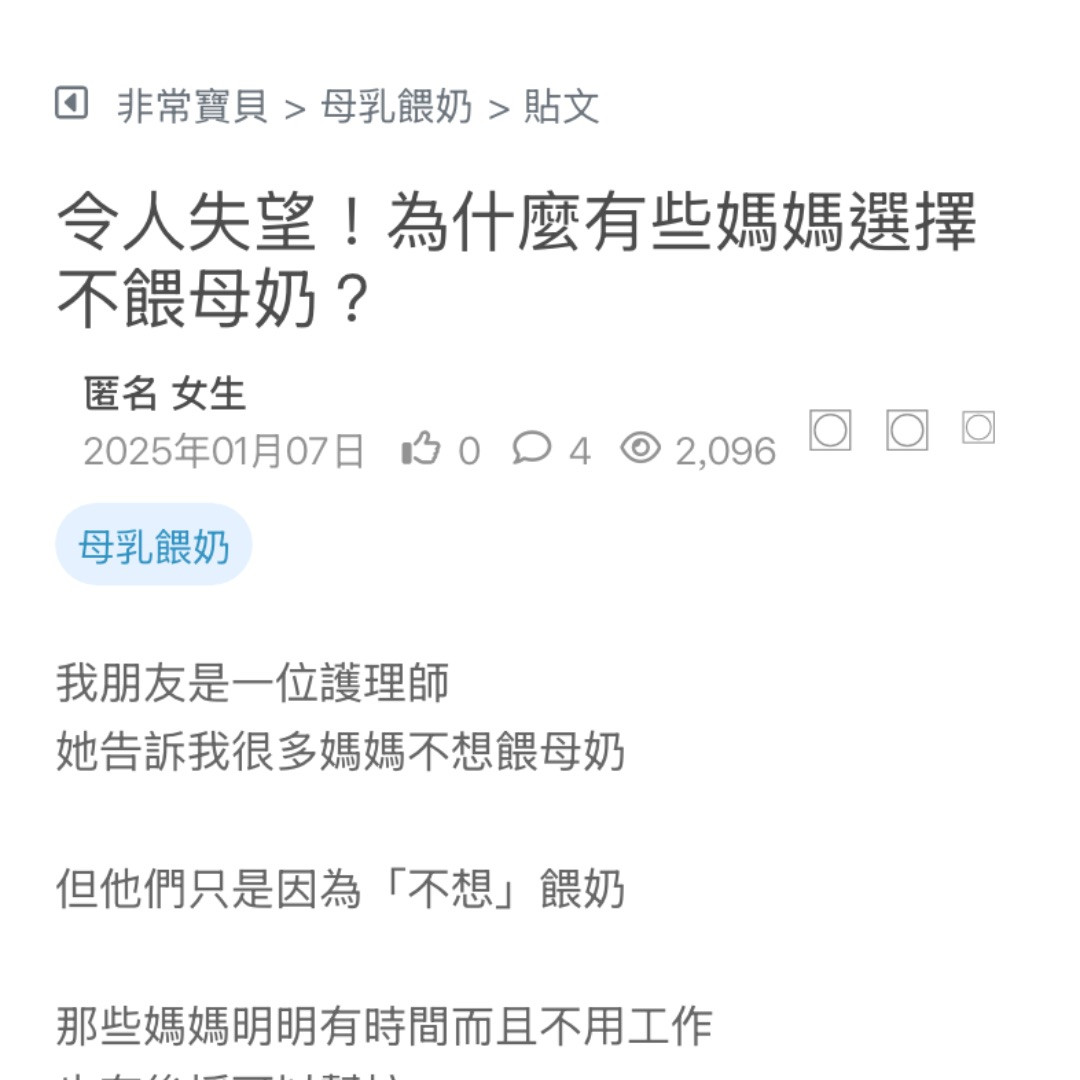 從生完寶寶開始,我媽知道我在餵母奶後,就一直勸我用配方奶,說母乳太麻煩,講什麼「母乳沒那麼有營養,小孩喝不飽」還問我是不是為了省錢才堅持餵母乳 但最大...