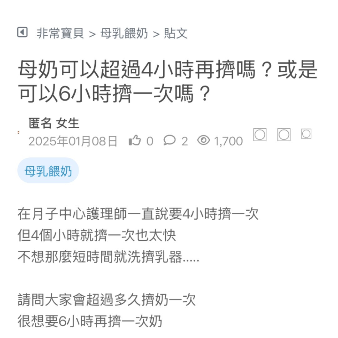 每6個小時擠一次奶 這樣會不會太久? 備註:目前已經2個禮拜維持6個小時擠一次奶,沒有硬塊 看更多