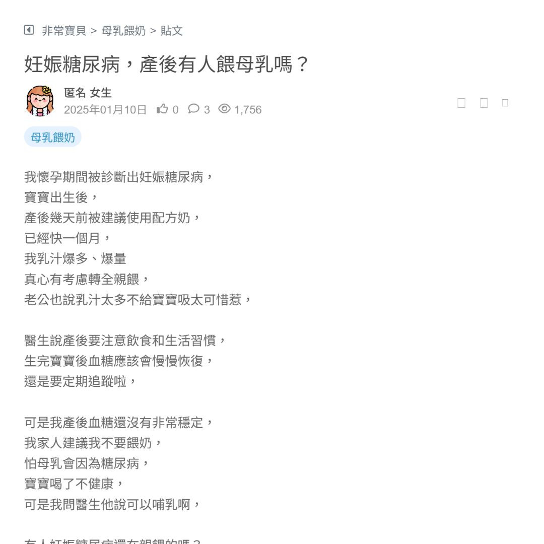 我當時產後要餵母乳,雖然有妊娠糖尿病,但醫生很支持,她說母乳不但對寶寶好,還能幫助媽媽調節血糖,對妳和寶寶都是好事。
