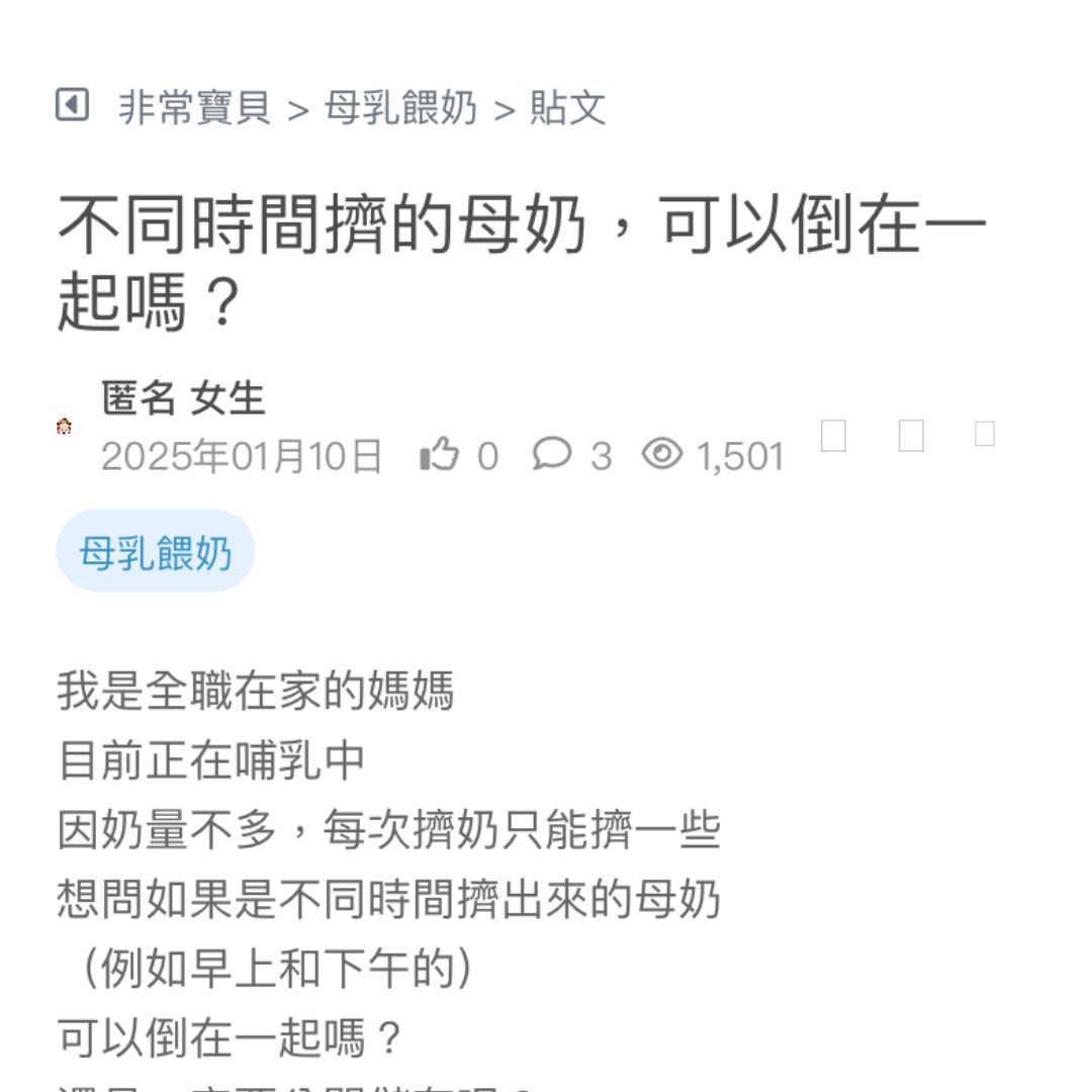 我是分開存的,因為每次量不同,萬一加在一起寶寶喝不完就要丟掉,我超珍貴的母乳就太浪費了,滴滴皆辛苦欸