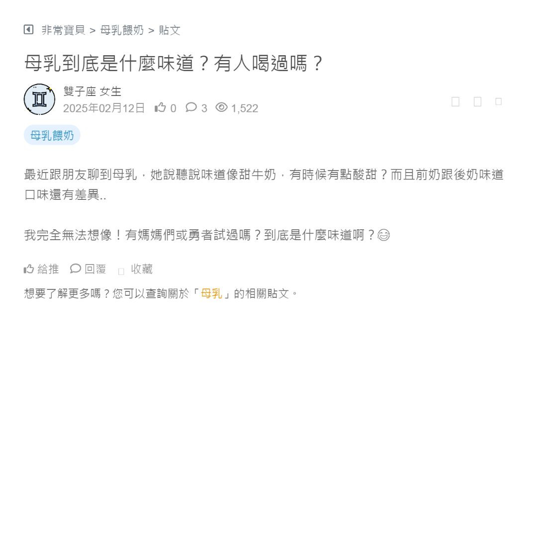 現在在哺乳中 最近老公一臉認真問我 「我想吸你一口母奶看看?」 我傻眼欸 差點下巴掉下來 這不是正常行為吧 我是保守沒錯…… 想知道大家的看法 母奶要給老公喝嗎? 這到底常不常見啦😵💫 看更多