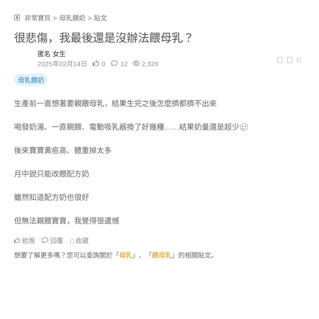 母乳真的不是每個人都能順利餵的,我當初為了追奶搞得自己壓力爆炸,結果心情越焦慮奶越少,最後也是乖乖餵配方!