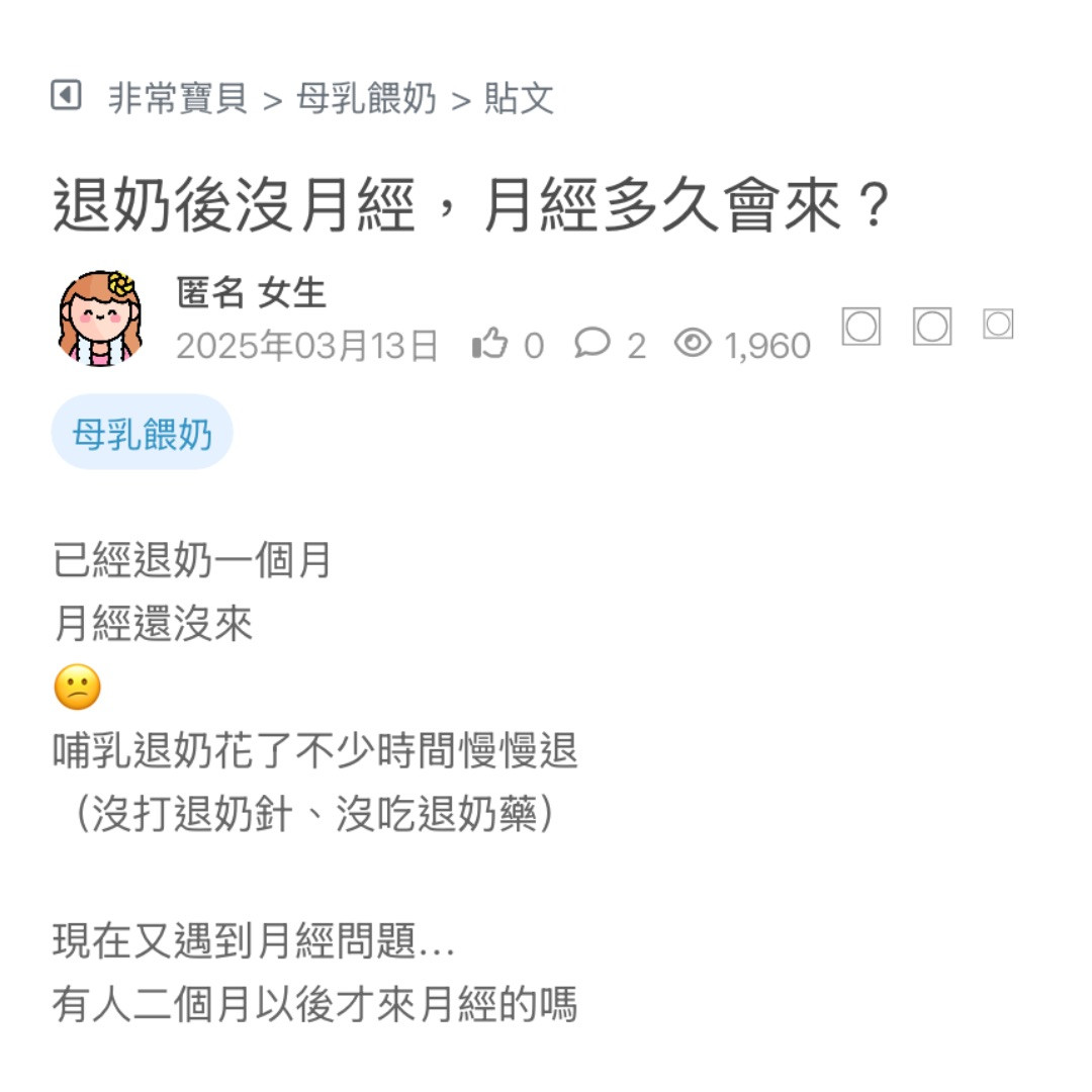 每個哺乳媽媽都辛苦了 退奶超不容易 但我好不容易退奶了 月經卻遲到 退奶後已經20天還沒來月經 一直焦慮😕怎麼還不來 我試過幾個方法 試過喝冰的 隔天 後來我...