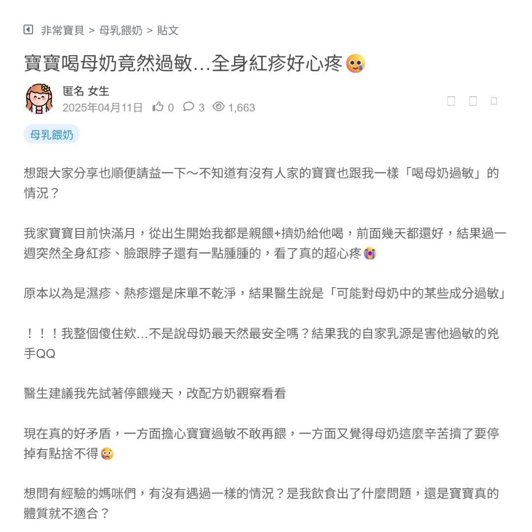 !!!我整個傻住欸…不是說母奶最天然最安全嗎?結果我的自家乳源是害他過敏的兇手QQ