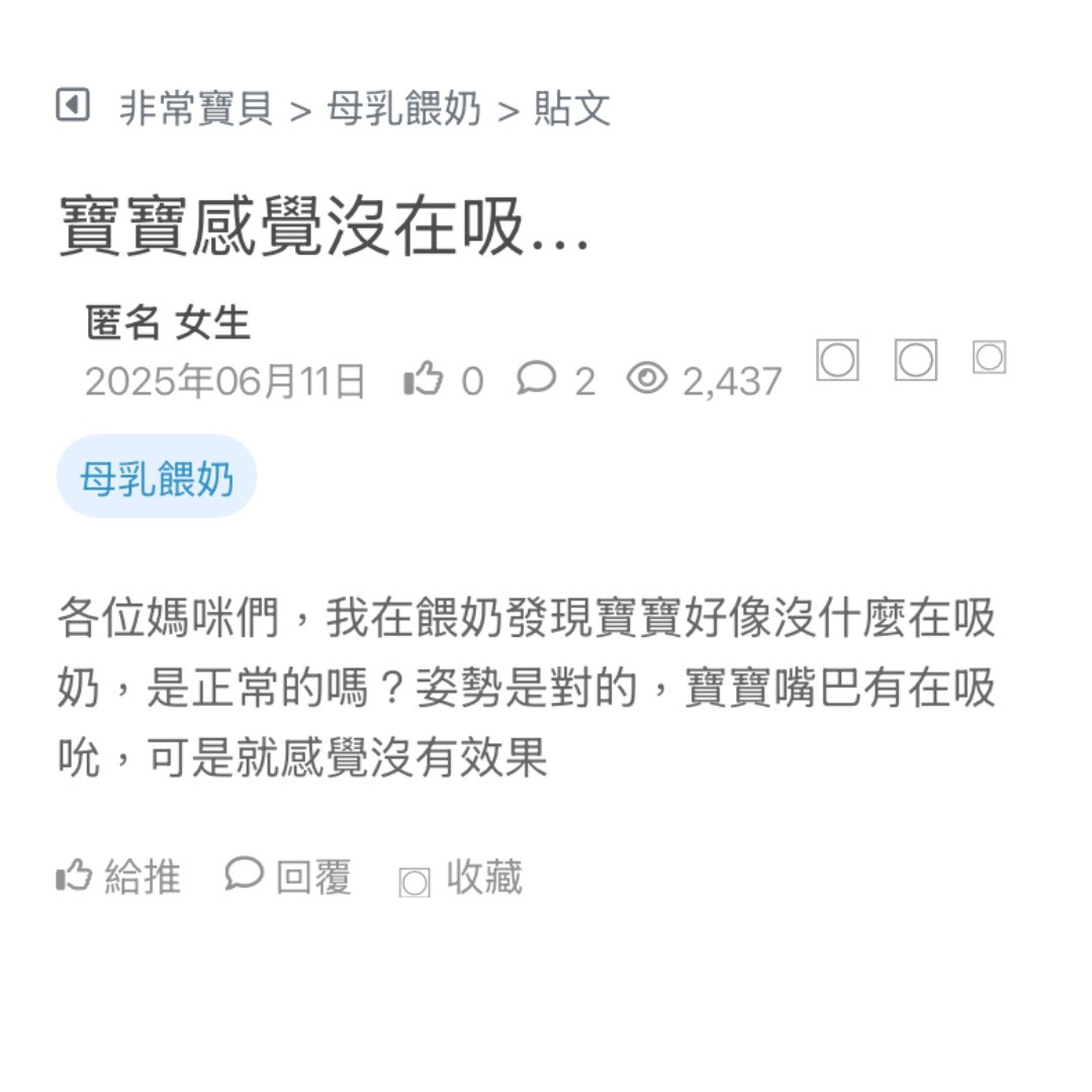 各位媽咪們,我在餵奶發現寶寶好像沒什麼在吸奶,是正常的嗎?姿勢是對的,寶寶嘴巴有在吸吮,可是就感覺沒有效果