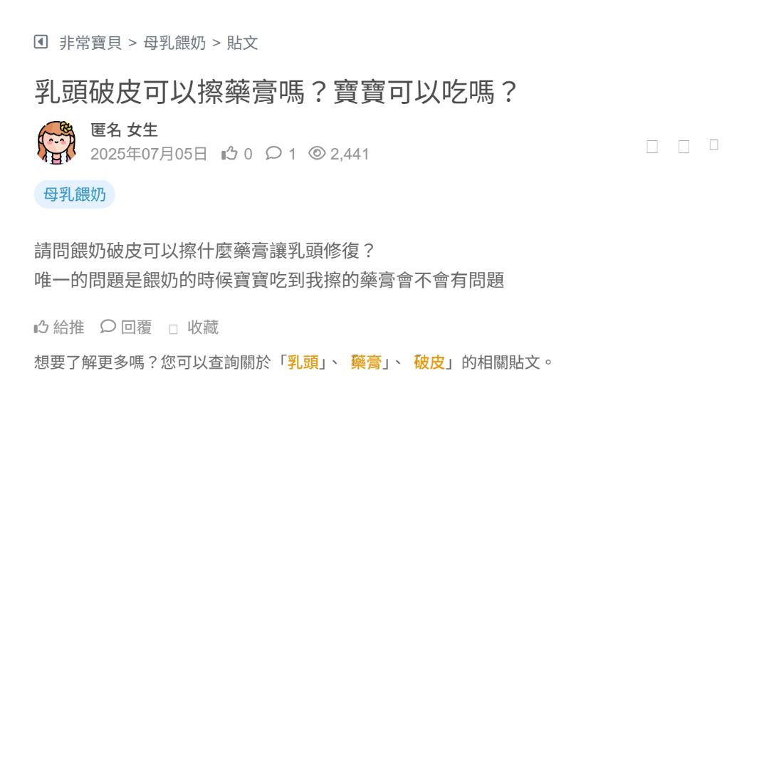 請問餵奶破皮可以擦什麼藥膏讓乳頭修復?