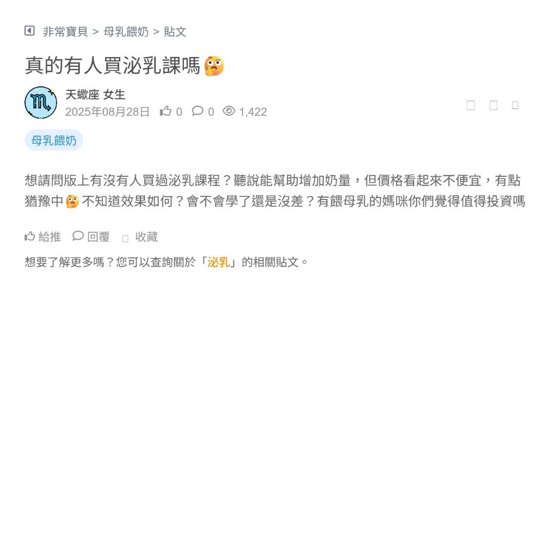 想請問版上有沒有人買過泌乳課程?聽說能幫助增加奶量,但價格看起來不便宜,有點猶豫中🤔不知道效果如何?會不會學了還是沒差?有餵母乳的媽咪你們覺得值得投資嗎