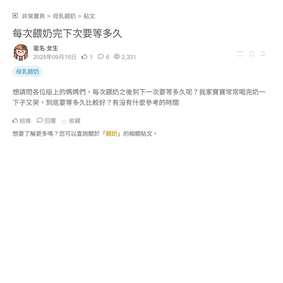 想請問各位版上的媽媽們,每次餵奶之後到下一次要等多久呢?我家寶寶常常喝完奶一下子又哭,到底要等多久比較好?有沒有什麼參考的時間