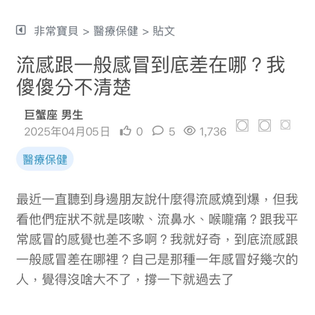 最近一直聽到身邊朋友說什麼得流感燒到爆,但我看他們症狀不就是咳嗽、流鼻水、喉嚨痛?跟我平常感冒的感覺也差不多啊?我就好奇,到底流感跟一般感冒差在哪裡?自己是那種一年感冒好幾次的人,覺得沒啥大不了,撐一下就過去了