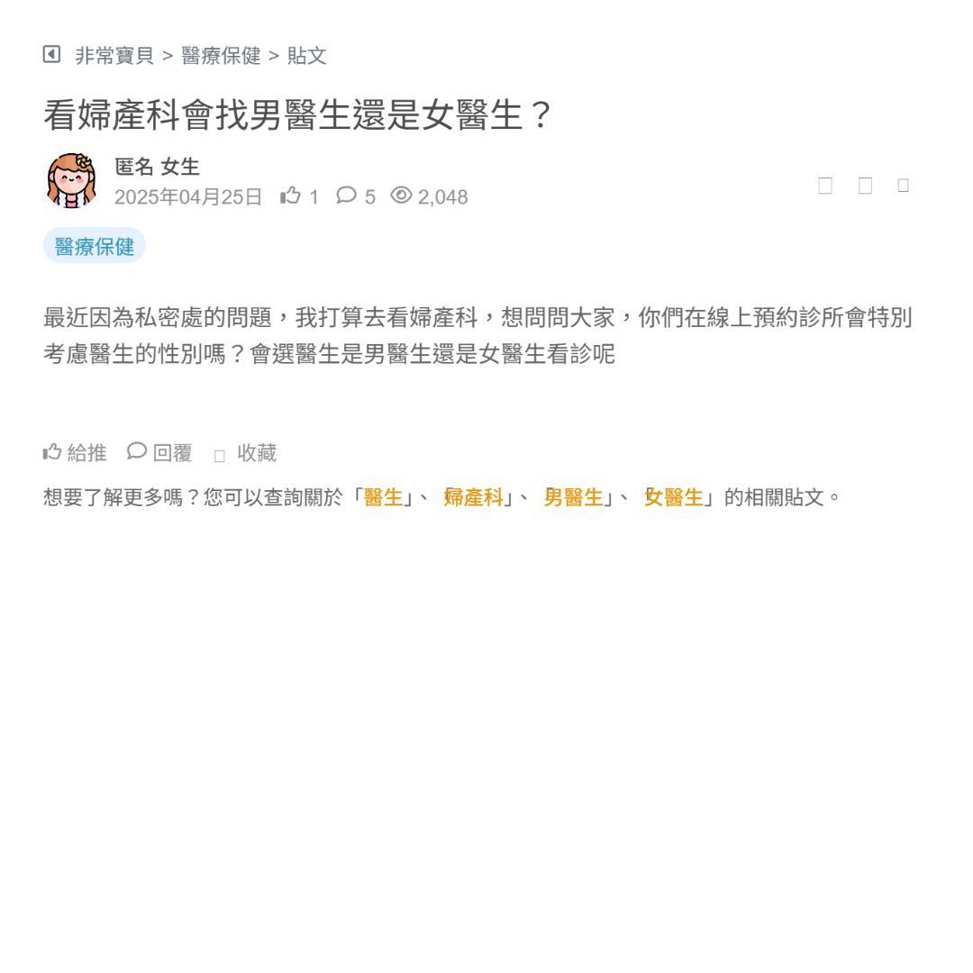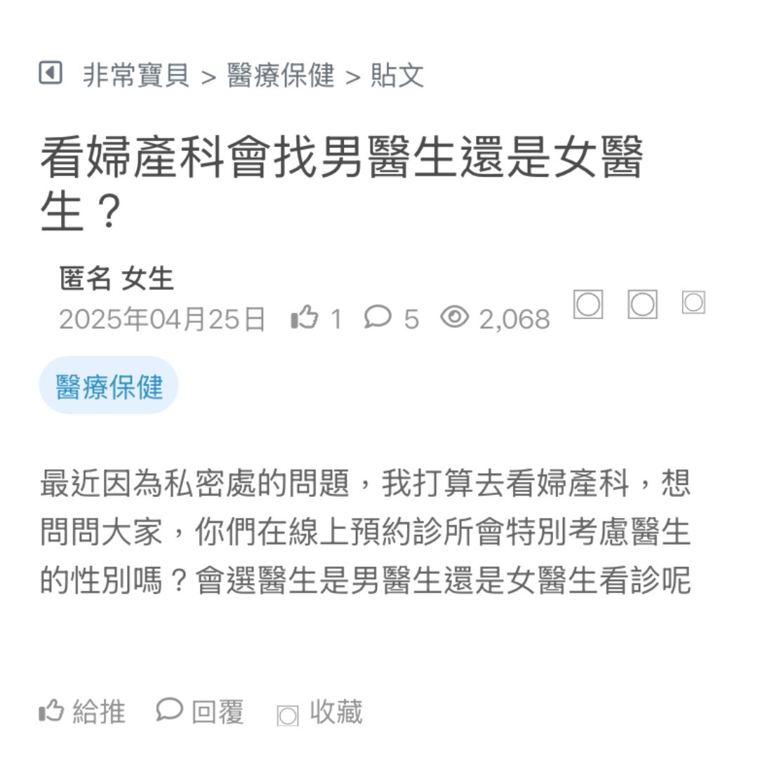最近因為私密處的問題,我打算去看婦產科,想問問大家,你們在線上預約診所會特別考慮醫生的性別嗎?會選醫生是男醫生還是女醫生看診呢