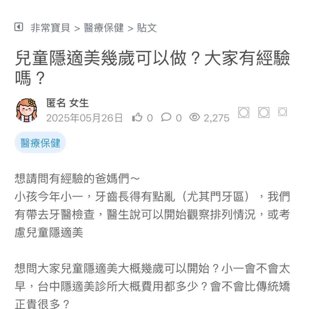 想問大家兒童隱適美大概幾歲可以開始?小一會不會太早,台中隱適美診所大概費用都多少?會不會比傳統矯正貴很多?