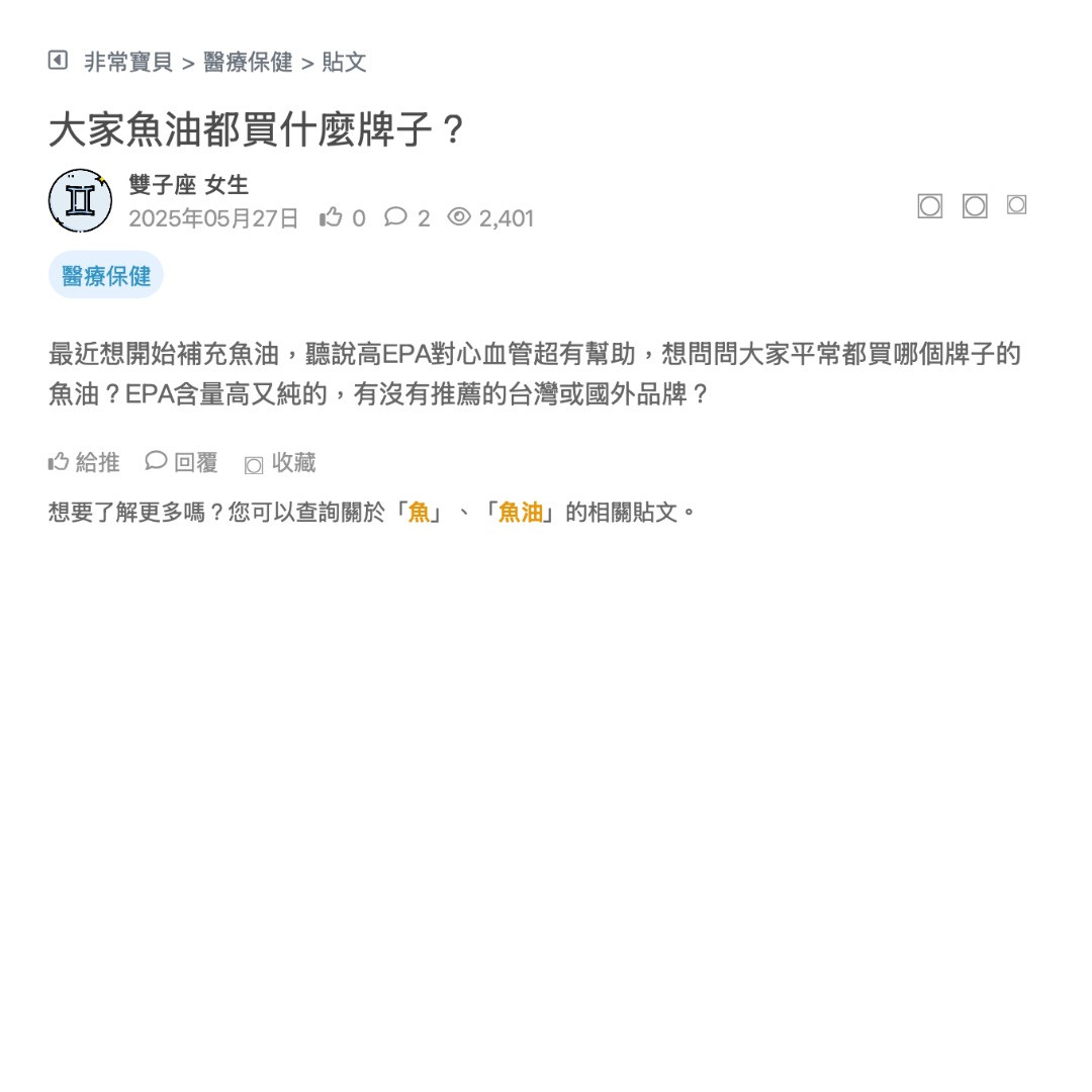 最近想開始補充魚油,聽說高EPA對心血管超有幫助,想問問大家平常都買哪個牌子的魚油?EPA含量高又純的,有沒有推薦的台灣或國外品牌?