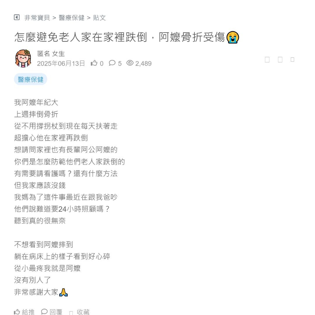 關於老人照護的小心得,想分享幾點我覺得還蠻重要的小心得給大家參考 第一,耐心真的很重要!長輩的行動可能變慢,記憶力也可能退化,別急躁,他們其實最需要的就是陪伴和理解。尤其是溝通上,要用心聽他們講話,不要打斷,哪怕話題重複,也給他們安全感。 第二,生活環境要安全。像家裡走道要裝扶手,避免滑倒,浴室... 看更多