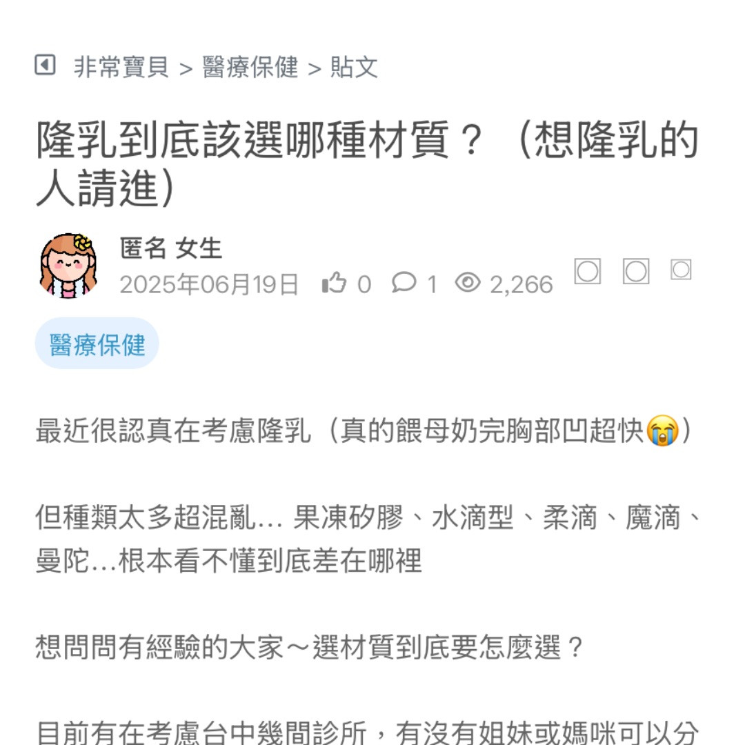 最近很認真在考慮隆乳(真的餵母奶完胸部凹超快😭)