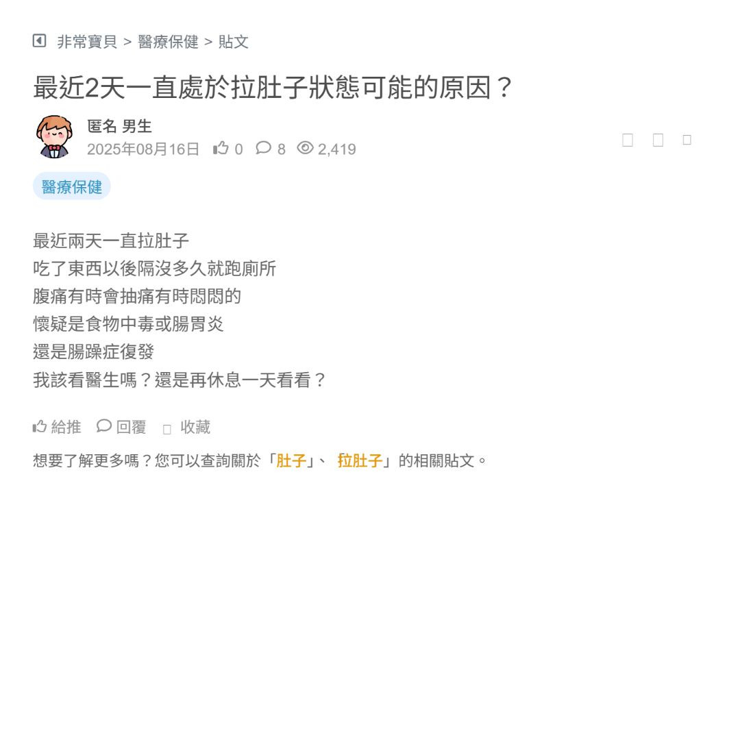 腸胃炎整個燥到不行 吃什麼都沒胃口 肚子不舒服 上廁所就…… 連感覺喝水都痛苦 要上班 大家腸胃炎會請假嗎? 看更多