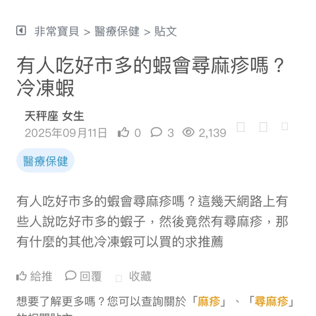 有人吃好市多的蝦會尋麻疹嗎?這幾天網路上有些人說吃好市多的蝦子,然後竟然有尋麻疹,那有什麼的其他冷凍蝦可以買的求推薦