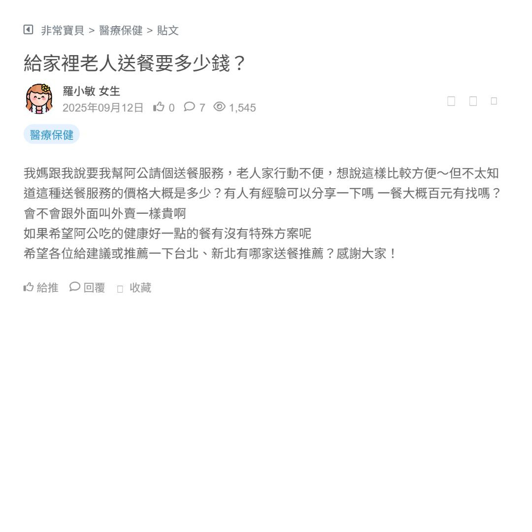 我媽跟我說要我幫阿公請個送餐服務,老人家行動不便,想說這樣比較方便~但不太知道這種送餐服務的價格大概是多少?有人有經驗可以分享一下嗎 一餐大概百元有找嗎?會不會跟外面叫外賣一樣貴啊