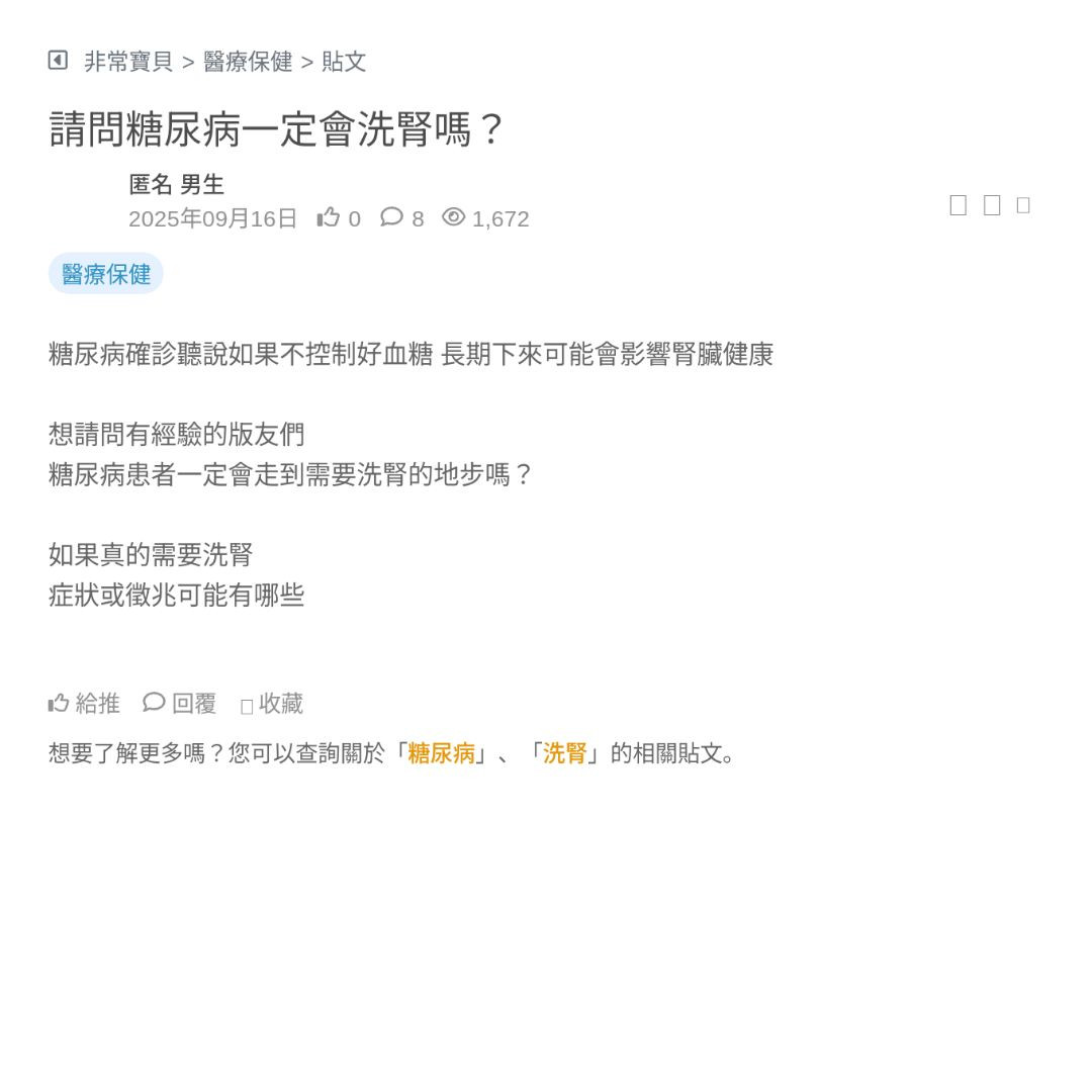 最近真的有點為家人的腎臟狀況擔心 雖然現在還沒到需要洗腎的程度 但每次回診看到指數上下波動 我心裡就會開始緊張 怕哪一天突然惡化得很快 身邊的人也有人說慢性腎臟病就是能拖多久算多久 但也有人分享說只要方法做對 是可以延後惡化速度的 我自己上網查到一堆資訊 什麼飲食要怎麼控、蛋白質怎麼算 不可以吃什麼、藥物要注... 看更多