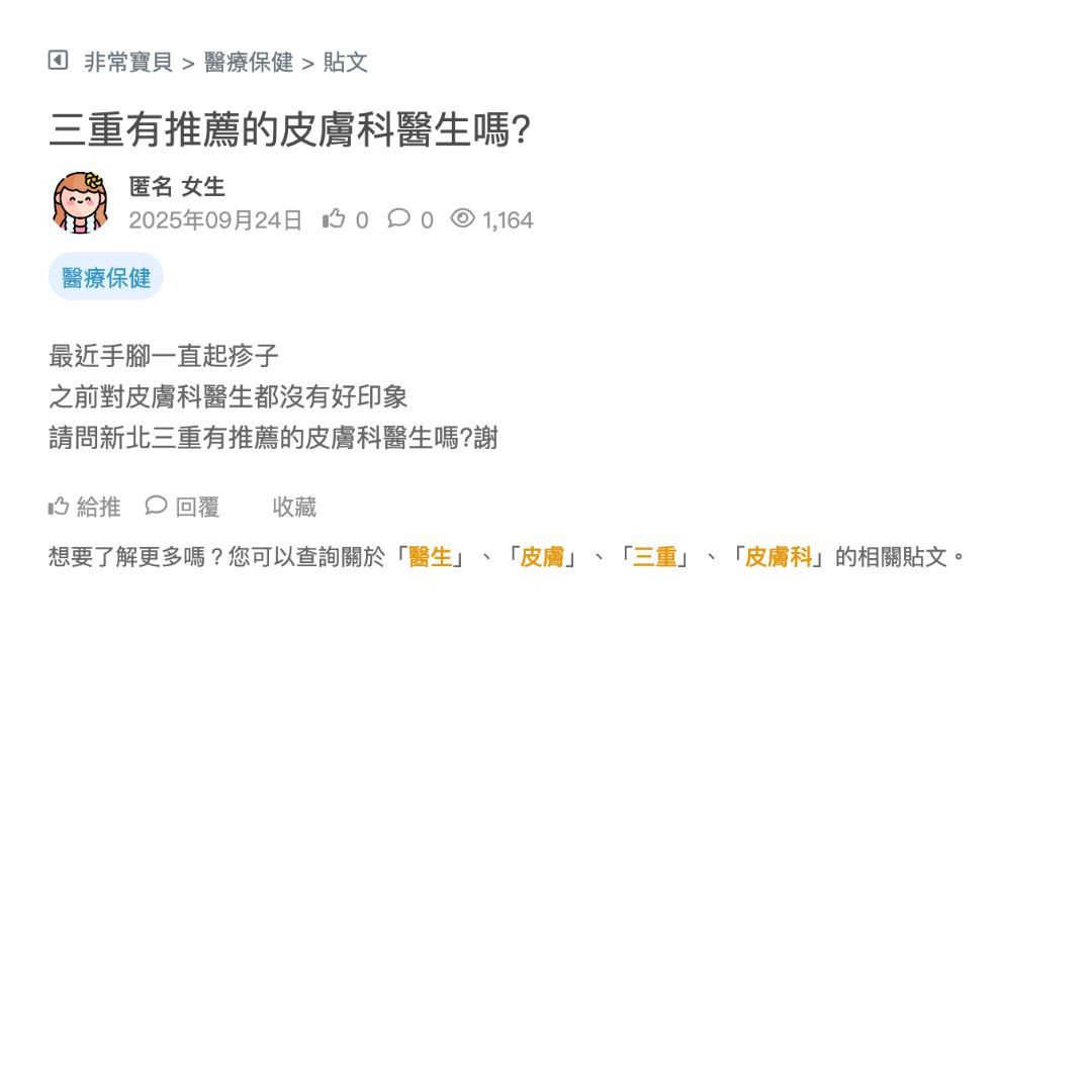 請問新北三重有推薦的皮膚科醫生嗎?謝
