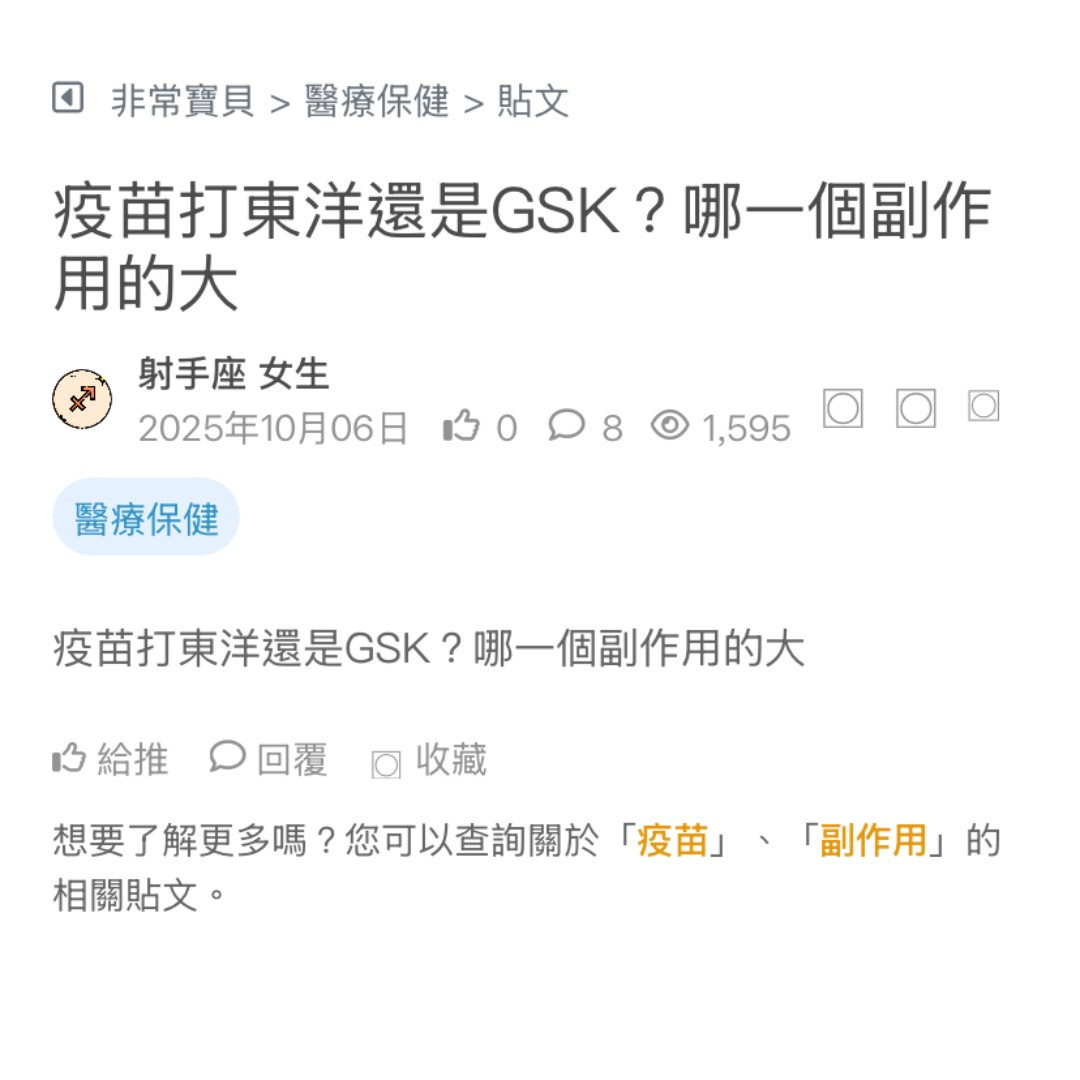 接種診所的護理師有說明東洋和GSK的常見反應差不多