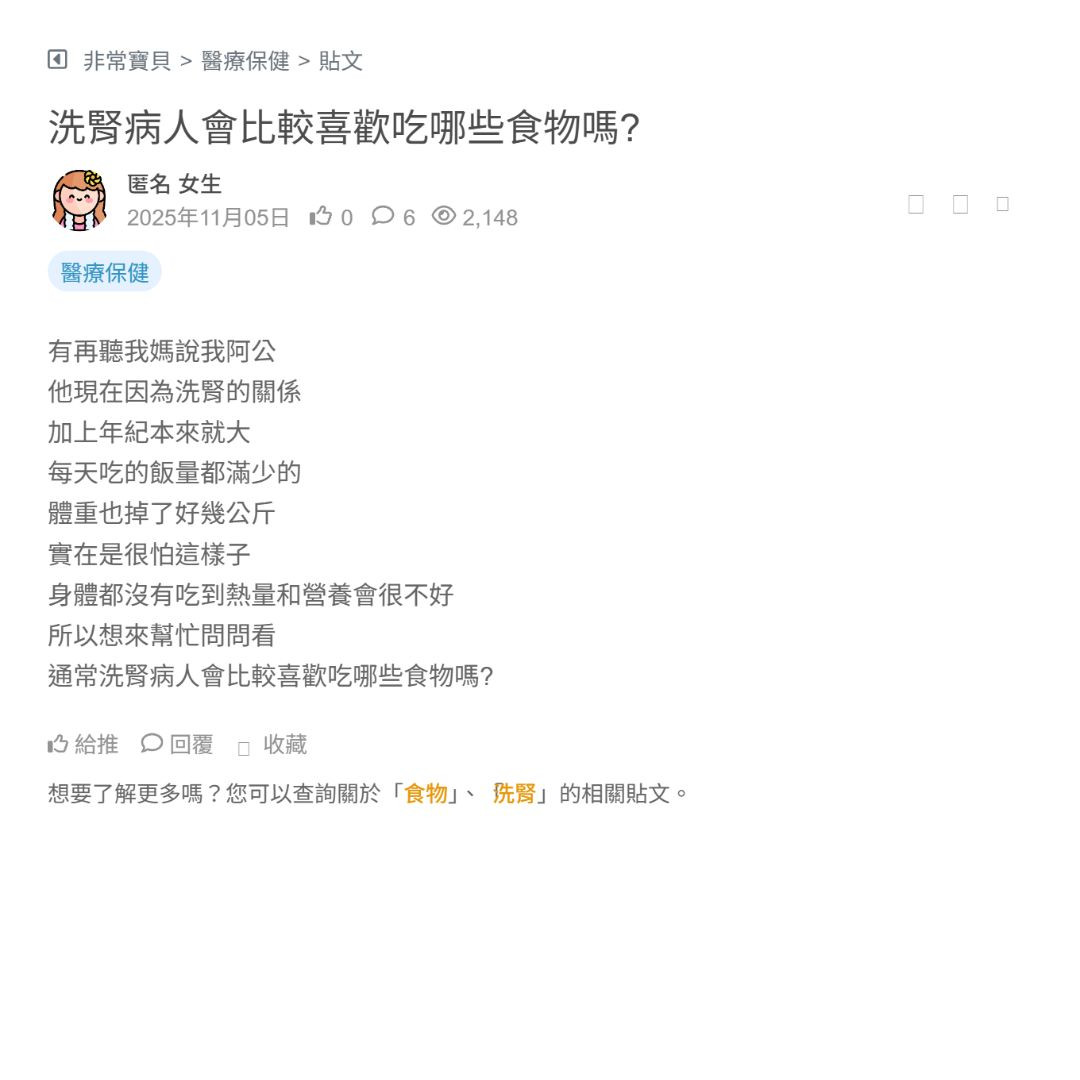 最近家人剛開始洗腎 說真的整個過程比我想像的還要需要調適 以前他至少還會出去散步 偶爾陪我們逛個超市但開始固定洗腎後 我明顯感覺到體力掉很快 走一小段路就會喘、吃東西也吃不多 整個人看起來就是容易累 雖然醫生說剛開始洗腎本來就需要一段時間讓身體習慣 可是身為家屬看到還是會忍不住擔心 也不知道是不是營養不夠 還... 看更多